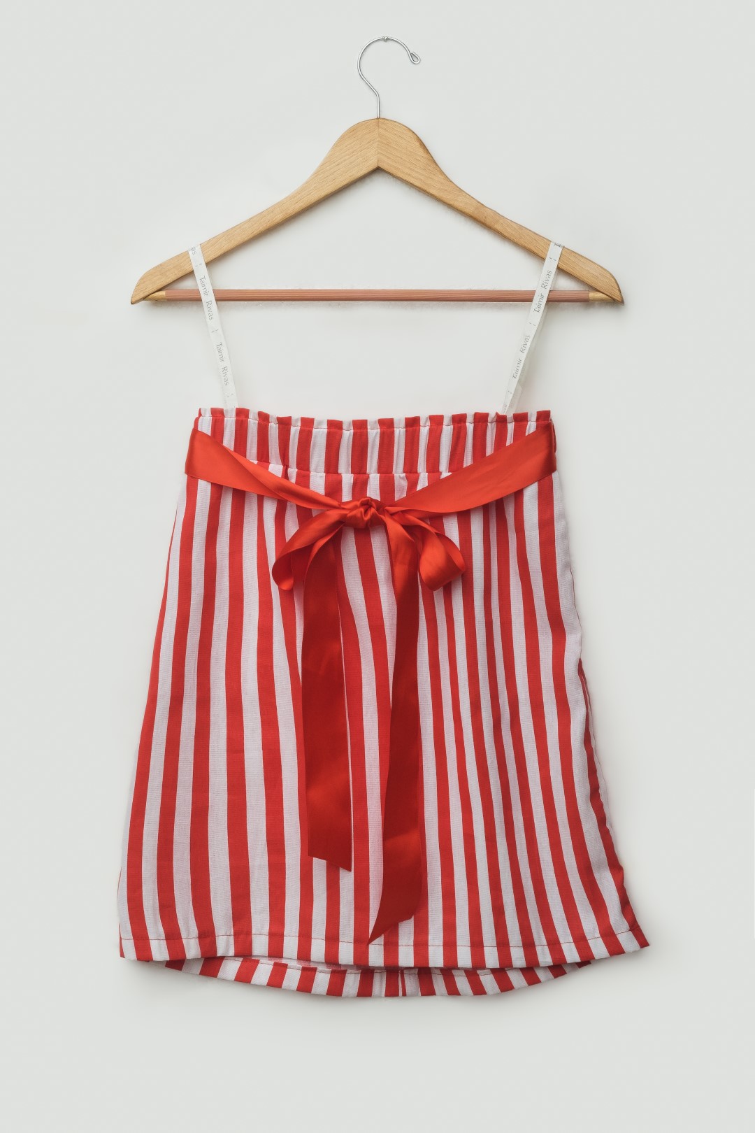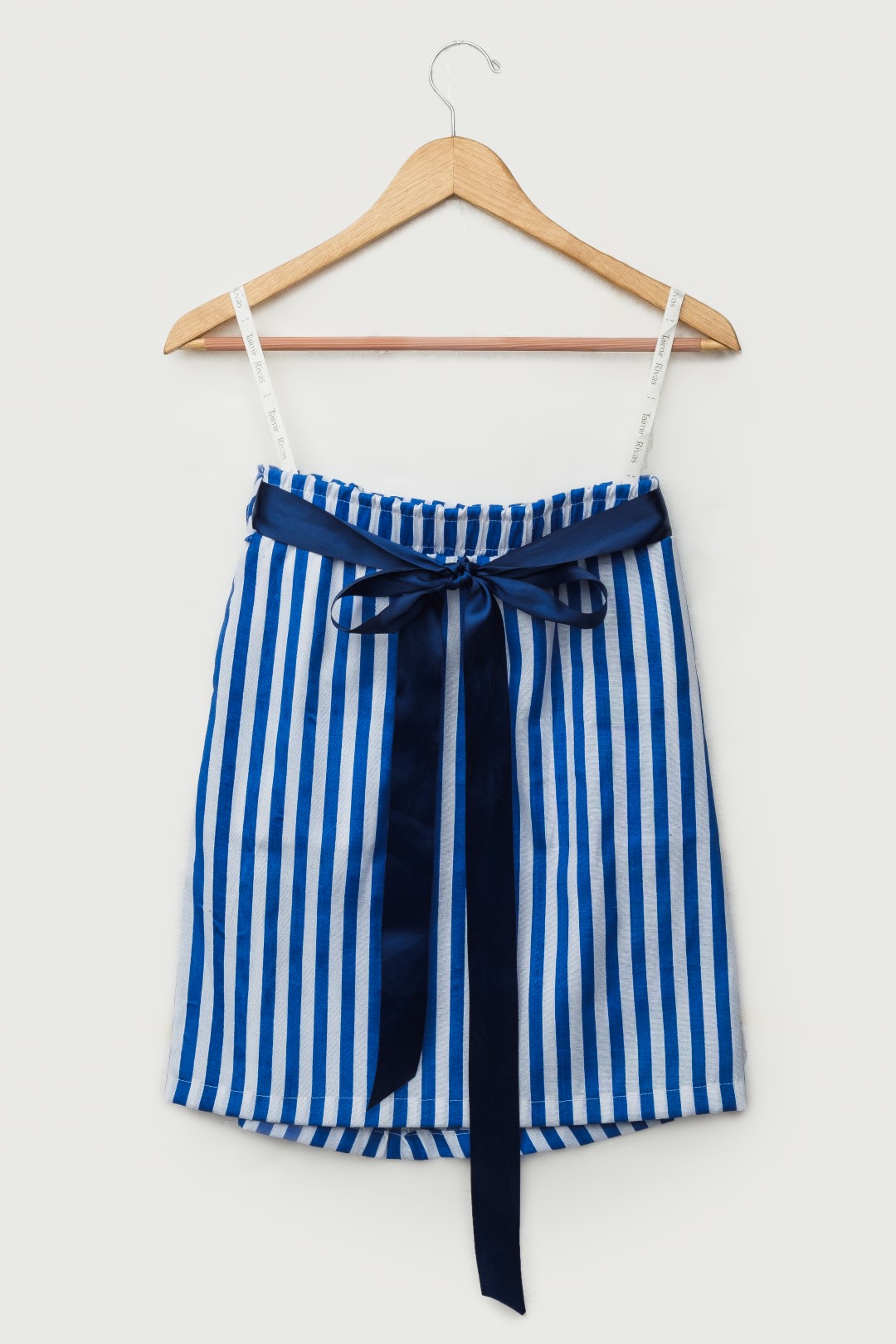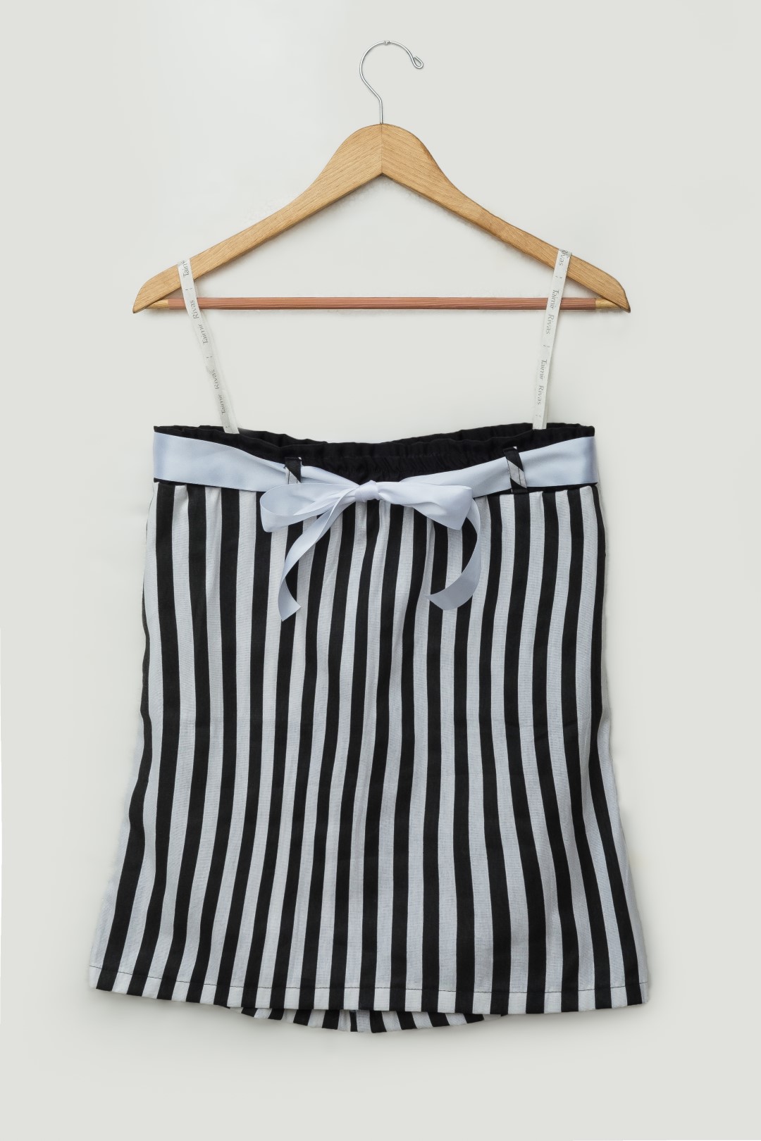 Falda elaborada en algodón de rayas, con bolsillos internos, cintura ajustable con liga gruesa rematada en cinta de raso unicolor.