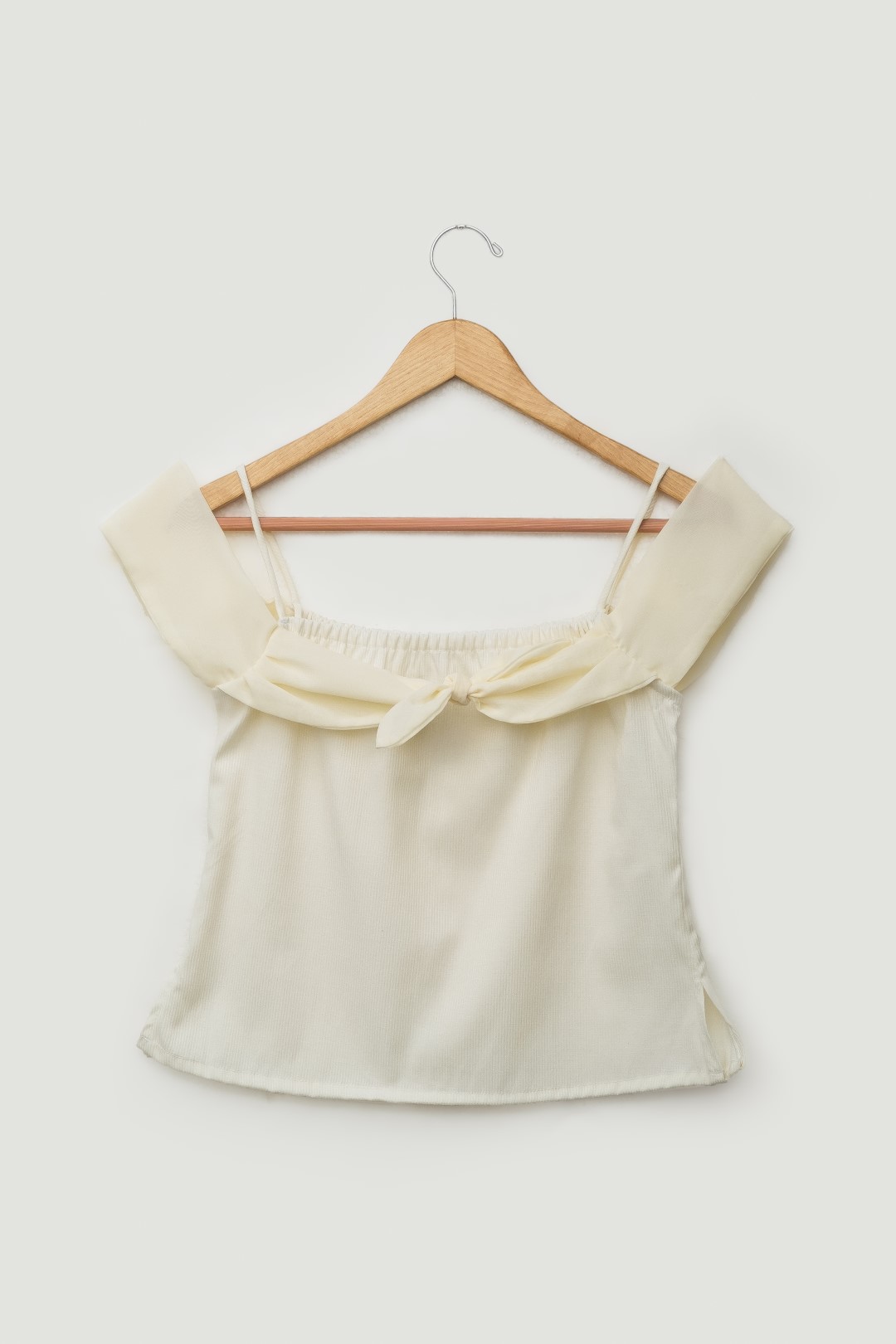 Top con tiras tipo off shoulder elaborado en pique de algodón con detalles de chiffon unicolor en mangas y nudo central ajustable, liga en espalda.