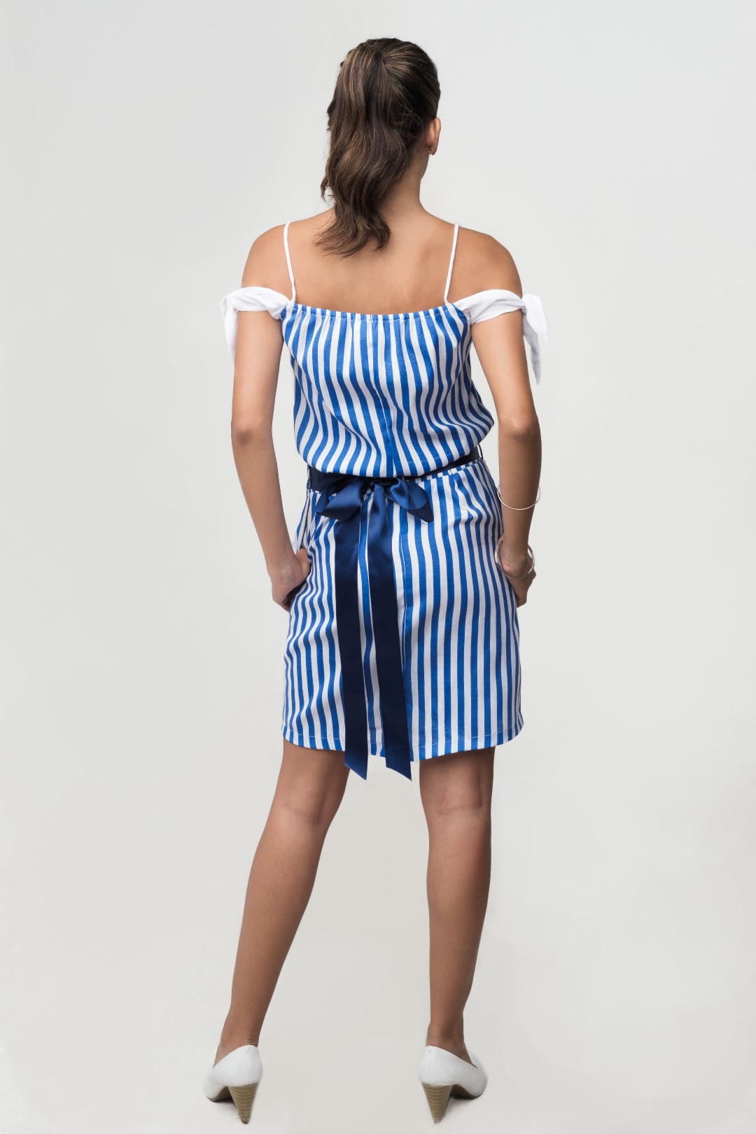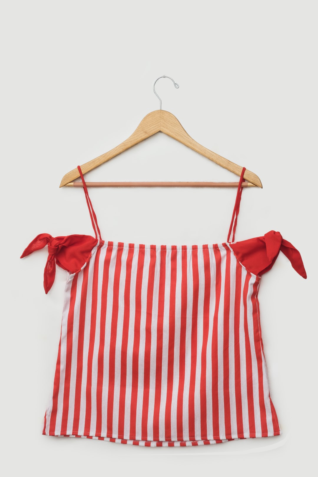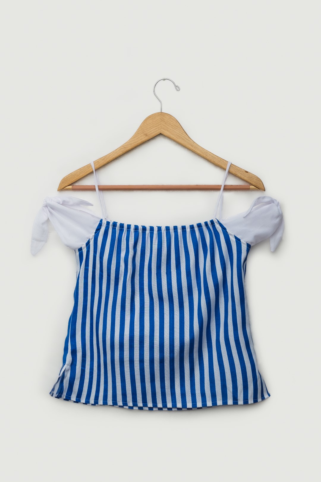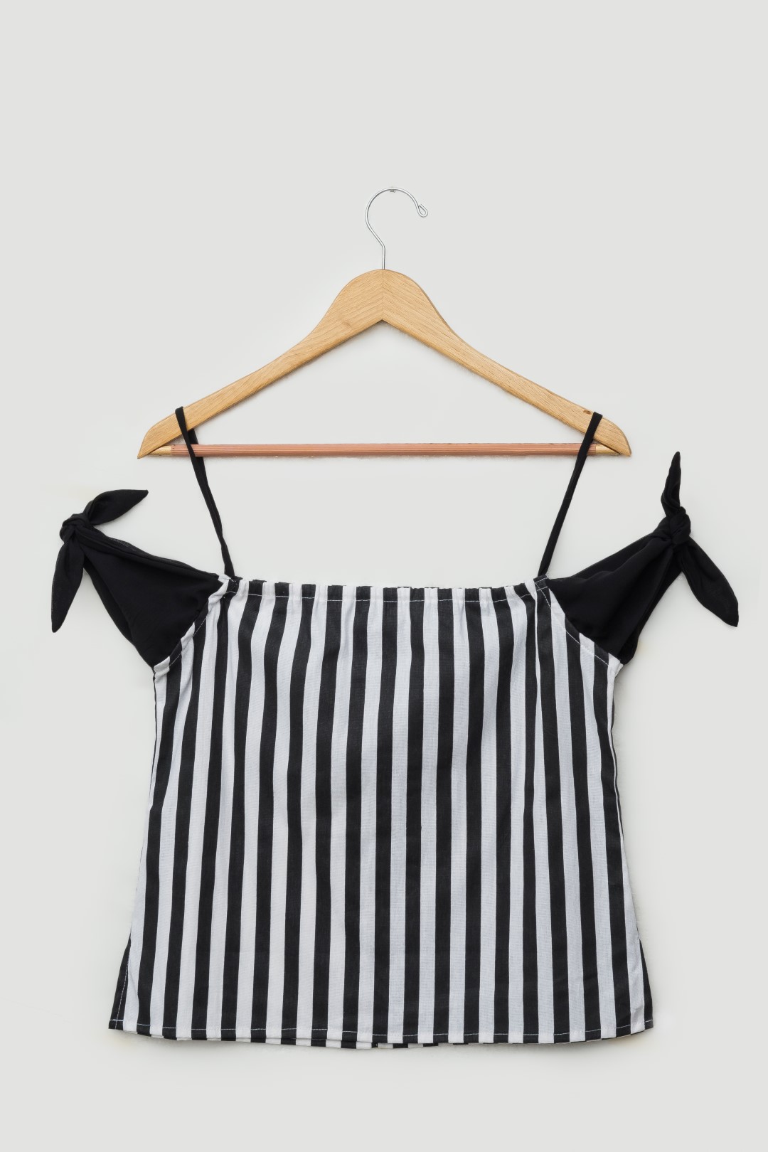 Top de tiras en algodón de rayas con nudos ajustables en brazos elaborados en chiffon unicolor, liga en espalda.